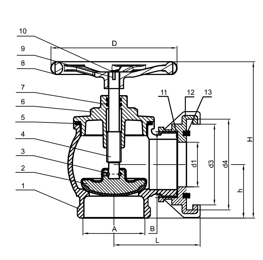 Van góc PCCC được cấu tạo bởi 05 thành phần chính là thân van, lá van, ty van, tay quay và ngàm