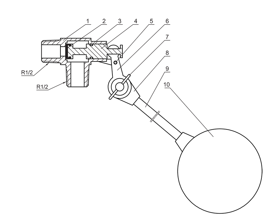 - Hệ thống phao: Gồm quả cầu thép chứa không khí gắn dạng ren với trục phao và cửa đóng bằng đồng.